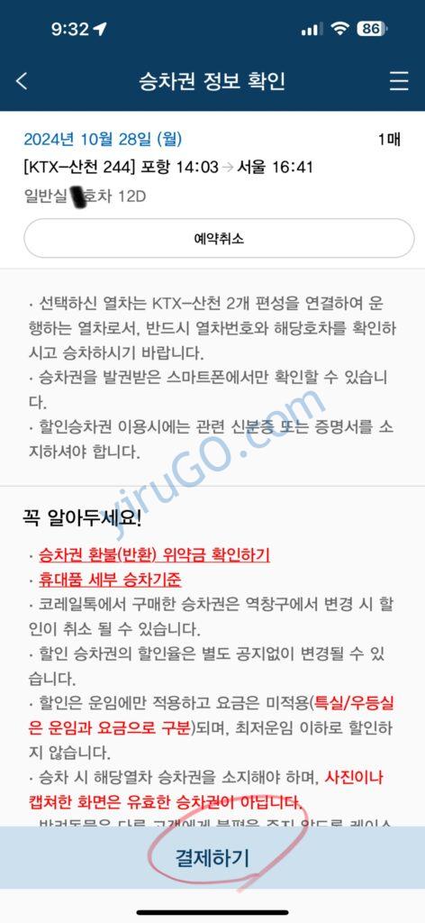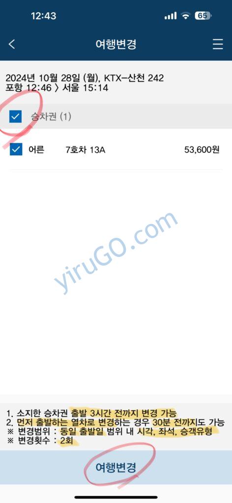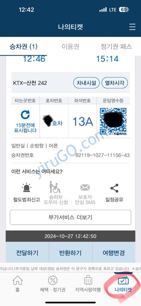 “나의티켓”을 클릭하면 아래와 같이 내 티켓 정보를 확인할 수 있다. 여기서 내가 구입한 승차권을 선택한다.화면 하단에는 반드시 주의해야 할 중요한 정보가 있다. 바로 변경 가능 시간, 변경 범위, 변경 횟수이다.