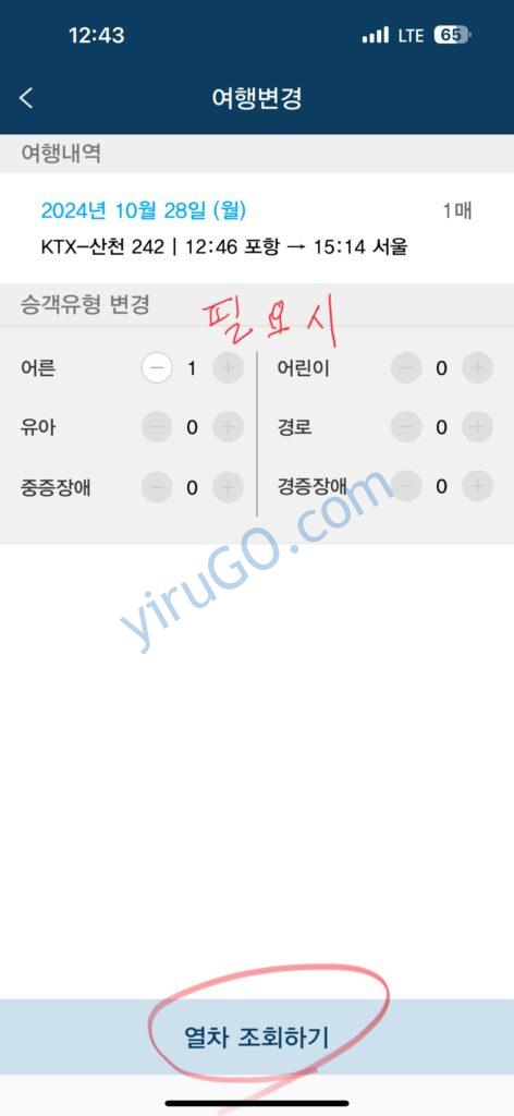 승객 유형 변경이 완료되었으면 화면 하단의 “열차 조회하기” 버튼을 누른다.