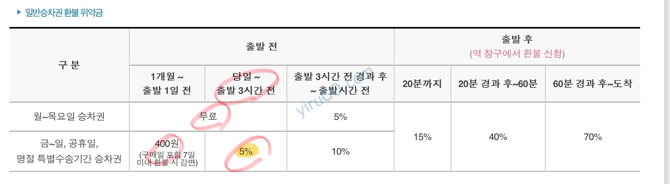 평일(월~목)에는 예약한 표를 출발 전에 취소하면 수수료가 없지만, 금요일을 포함한 주말에 취소하면 건당 400원의 수수료가 부과된다.