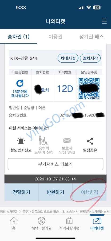 “나의티켓”을 클릭하면 아래와 같이 내 티켓 정보를 확인할 수 있다. 여기서 내가 구입한 승차권을 선택한다.화면 하단에는 반드시 주의해야 할 중요한 정보가 있다. 바로 변경 가능 시간, 변경 범위, 변경 횟수이다.