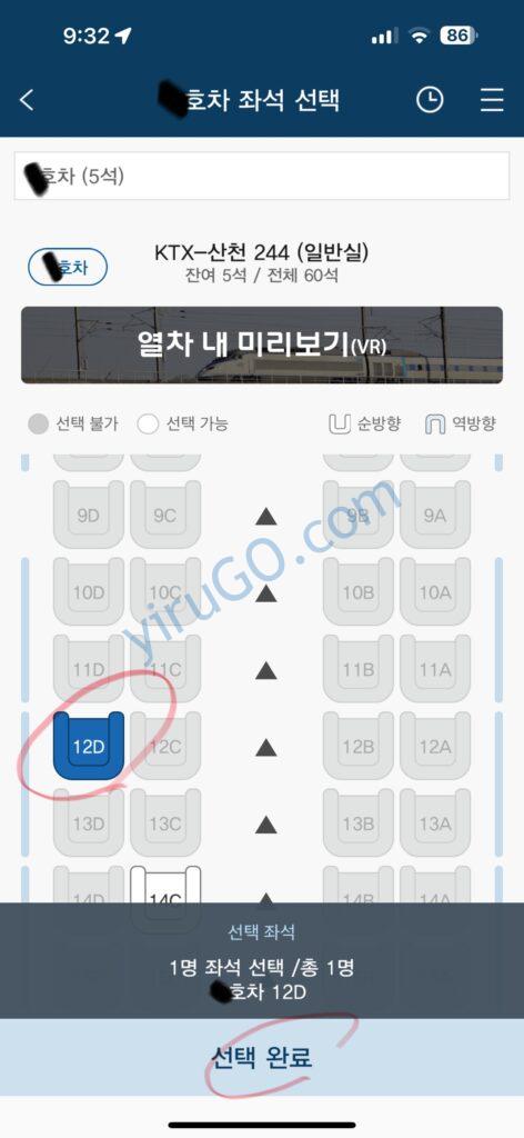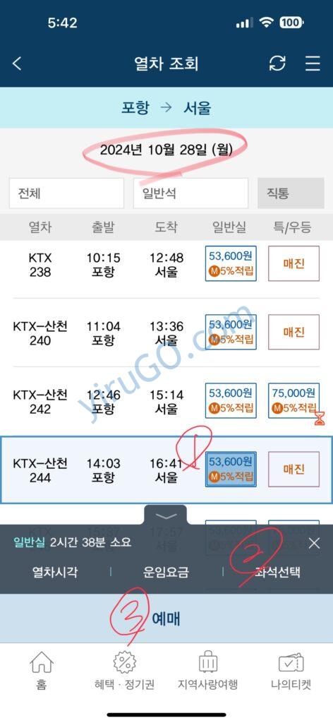 먼저 화면 상단에서 날짜를 확인한 후, 아래에서 변경할 시간, 일반실/특실, 좌석을 순서대로 선택한다.