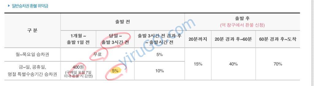 평일(월~목)에는 예약한 표를 출발 전에 취소하면 수수료가 없지만, 금요일을 포함한 주말에 취소하면 건당 400원의 수수료가 부과된다.
