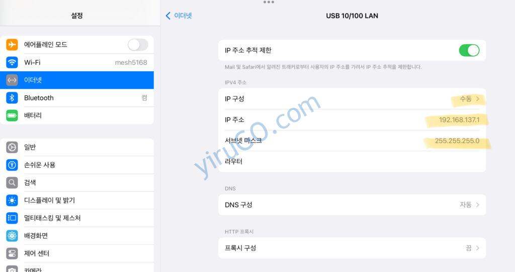 아이패드와 라즈베리파이를 USB 네트워크 어댑터로 연결한 후, [설정] → [이더넷] → [USB 10/100 LAN] 메뉴를 선택하여 네트워크 설정을 진행합니다. 이 과정에서 IP 구성을 수동으로 설정해야 한다.