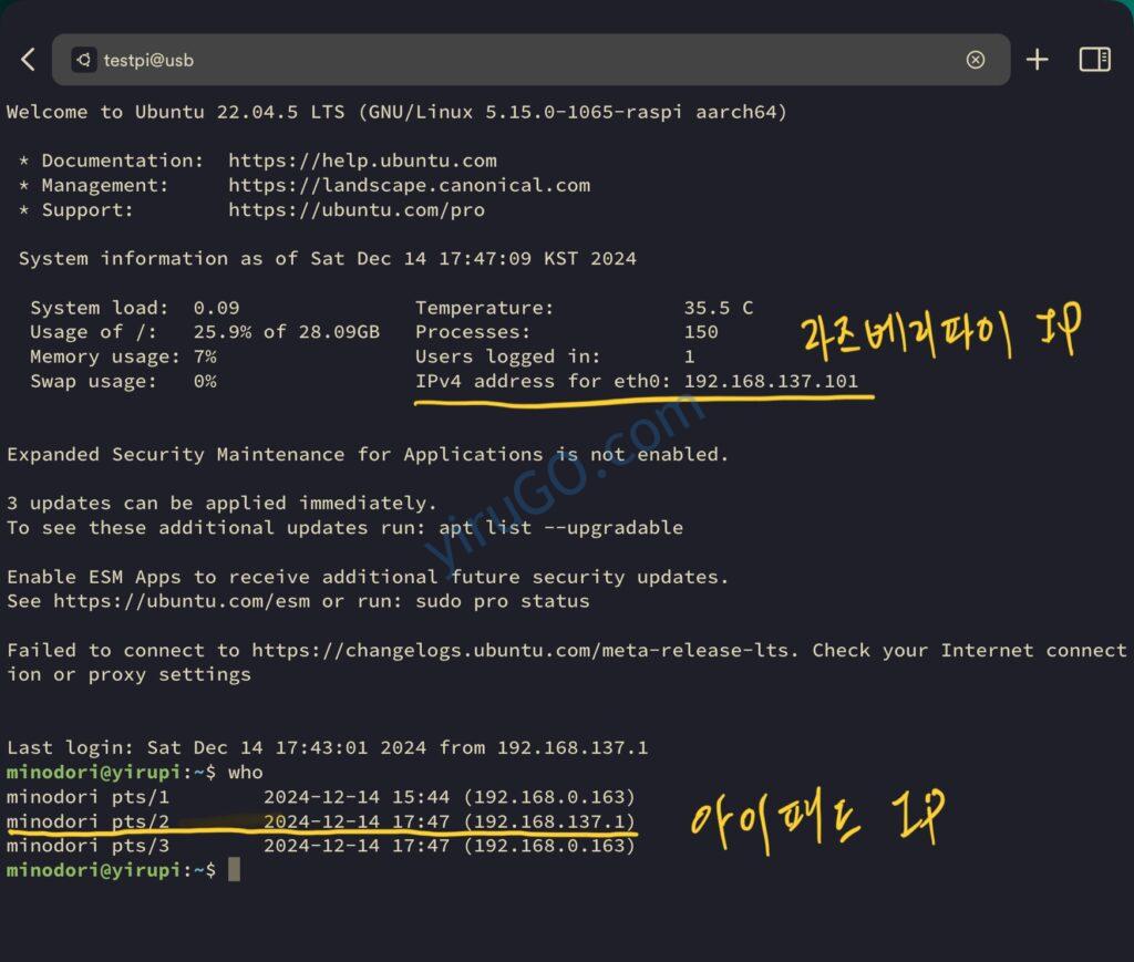 초기 화면에서 접속한 라즈베리파이 IP와 “who” 명령을 통해서 현재 라즈베리파이에 접속한 유저를 확인할 수 있다. 두번째 “pts/2″로그인한 ‘minodori”가 아이패드(192.168.137.1)에서 접속했음을 일 수 있다.