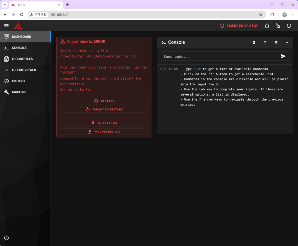 이제 Klipper 설치가 완료되었으므로, 브라우저를 통해 Klipper가 설치된 라즈베리 파이에 접속해 보자. 아래 이미지와 같이 처음 접속하면 접속 자체는 가능하지만, 에러가 발생한다. 이는 Klipper 설치만 완료되었을 뿐, 프린터 설정이 아직 진행되지 않았기 때문이다.