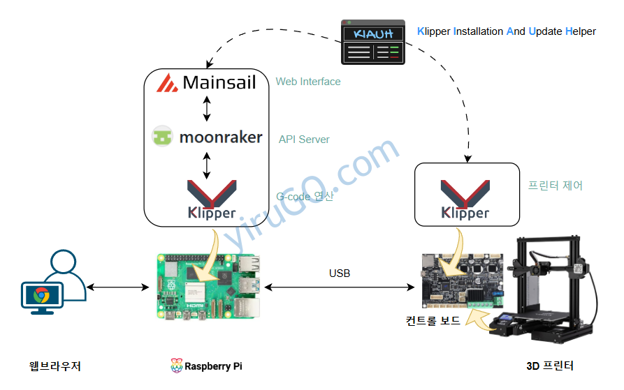 Mainsail OS는 Raspberry PI OS를 기본으로 Klipper, Moonraker, Mainsail 소프트웨어를 추가한 것으로 보면된다. 설치가 제일 간단하지만 추가된 Klipper, Moonraker, Mainsail 가 최신 버전이 아닐 수 있다. - Klipper – 라즈베리 파이와 3D 프린터의 컨트롤 보드에 각각 설치된다. 라즈베리 파이에 설치된 클리퍼는 G-code를 빠르게 연산해주는 역할을 하며, 컨트롤 보드에 설치된 클리퍼 펌웨어는 프린터의 제어 기능을 담당한다.