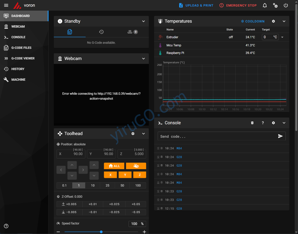 제어보드와 3D 프린터의 배선 연결이 제대로 되었는지를 판단하기 위해 간단한 printer.cfg를 작성해서 클리퍼에 성공적으로 접속했다. 아래와 같이 정상적으로 접속되는 것을 확인했다.
