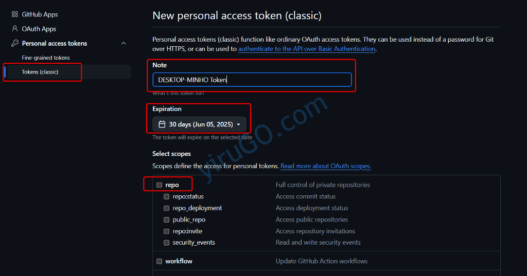 - 좌측 메뉴에서 Developer settings → Personal access tokens → Tokens (classic) 선택